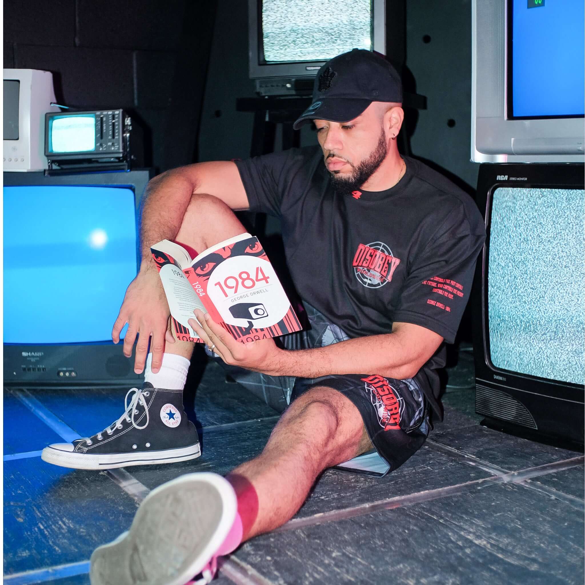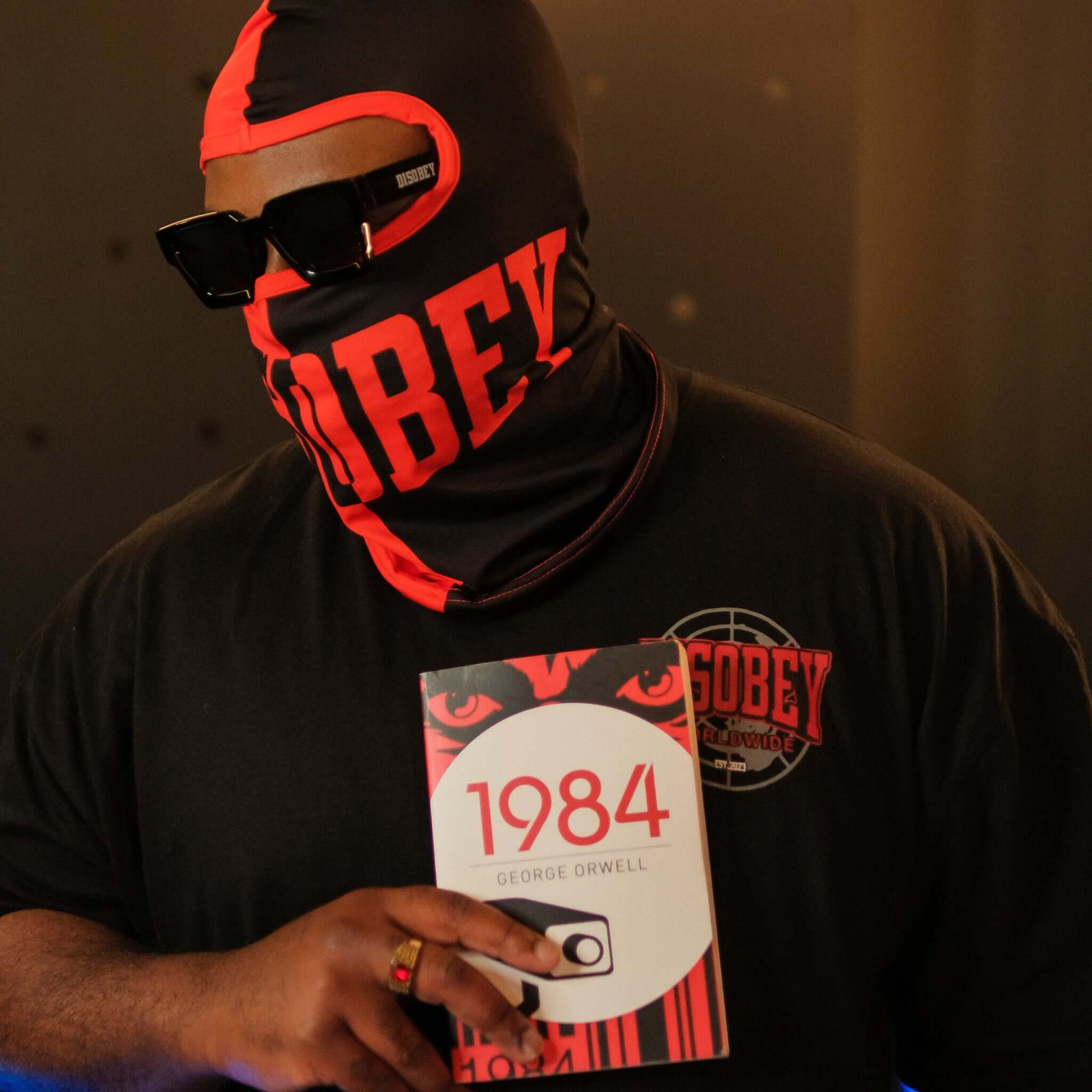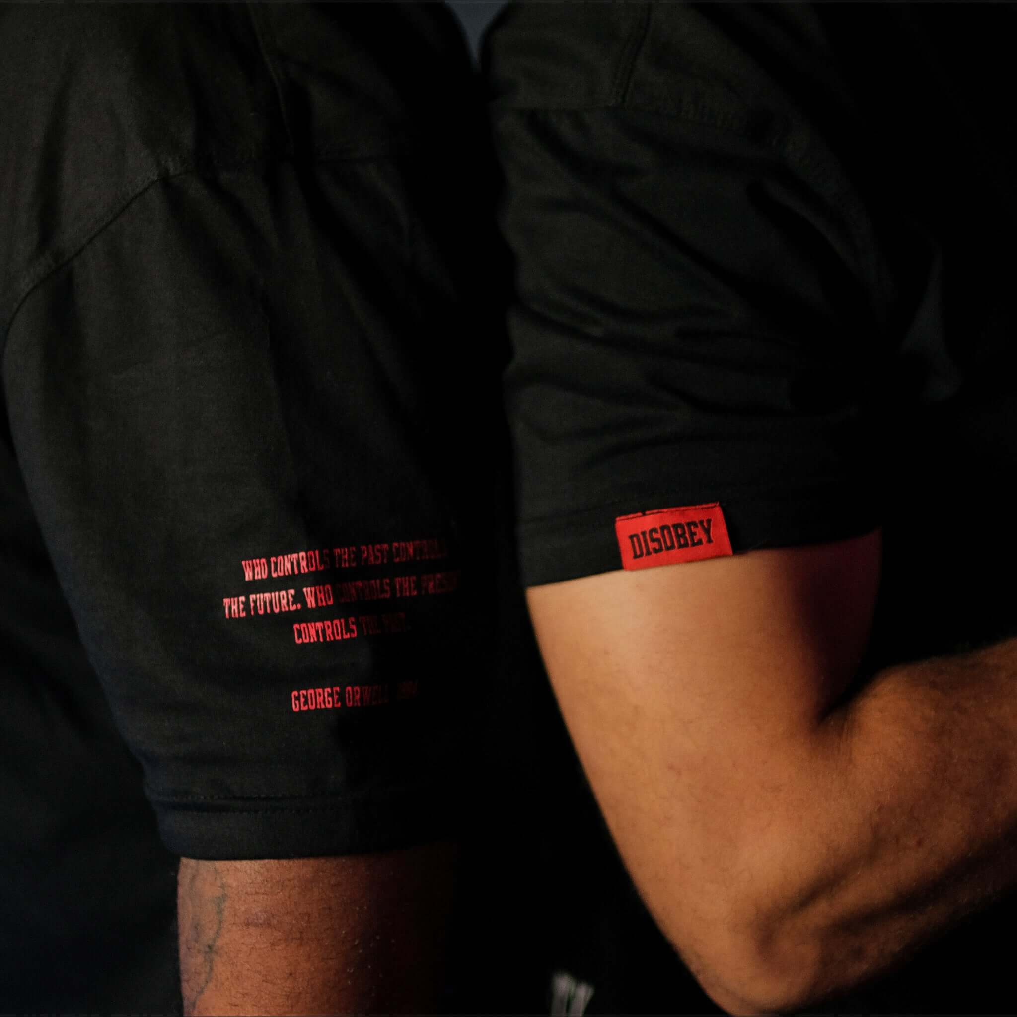 - Left Sleeve: Features the iconic quote from George Orwell’s 1984—“Who controls the past controls the future. Who controls the present controls the past.”